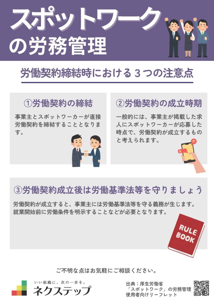 スポットワーカーと事業主は直接、労働契約を結ぶ必要があります。
