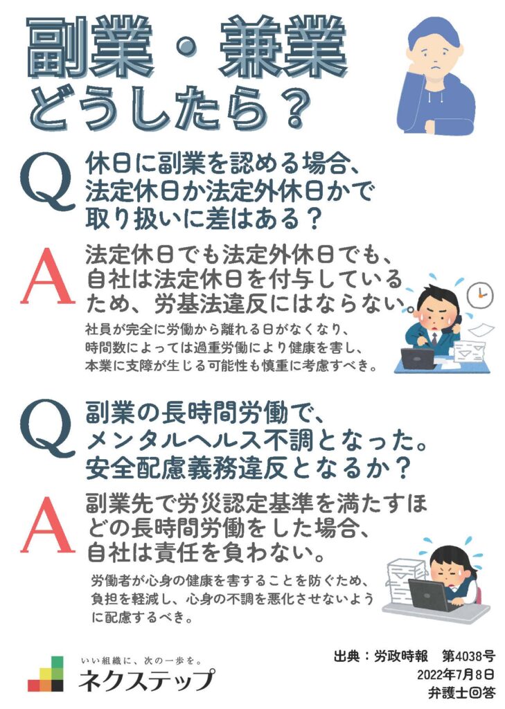 副業を「法定休日」に行っても「法定外休日」に行っても、自社として法定休日をきちんと付与していれば労基法違反にはならない。