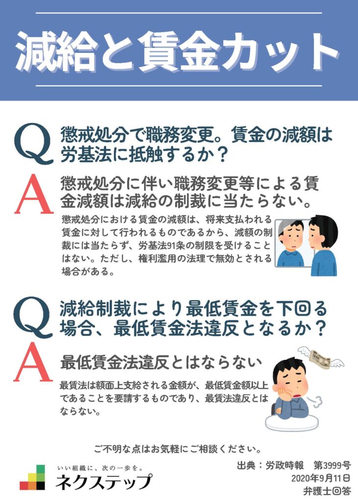 減給と賃金カット③ 2025年7月9日 最終更新日時 : 2025年11月6日 nextep_admin 減給と賃金カット 懲戒処分での職務変更による減額 将来の賃金を下げるものであり、減給の制裁には当たらない(ただし不当な場合は無効の可能性あり)。 減給で最低賃金を下回る場合 支払われる賃金が最低賃金以上なら、最低賃金法違反にはならない。