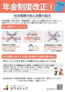 社会保険(厚生年金・健康保険)の加入対象が拡大され、より多くの働く人が加入しやすくなります。給与要件や企業規模の制限が段階的に撤廃され、ライフスタイルに合わせた働き方を選びやすくなります。また、個人事業所でも常時5人以上 […]