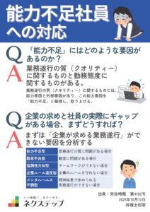 能力不足には「業務の質」と「勤務態度」の2つの要因がある。まずは企業が求める業務ができない原因(能力・勤怠・協調性・ルール違反・メンタル不調など)を分析する。原因を見極めたうえで、適切な指導・対応につなげることが重要。